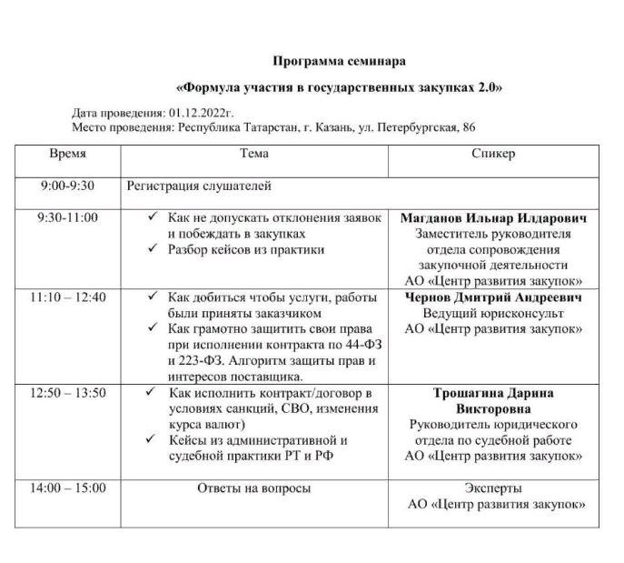 Государственный комитет Республики Татарстан по закупкам совместно с АО «Центр развития закупок РТ» 1 декабря 2022 года проводит бесплатный семинар «Формула участия в госзакупках 2.0» и приглашает принять участие в нем поставщиков товаров, работ, услуг, в том числе субъектов малого и среднего предпринимательства, социально ориентированных некоммерческих организаций (далее – СМП, ССП, СОНКО) и организаций инвалидов.Семинар состоится 1 декабря 2022 года с 9:30 до 15:00 по адресу: г. Казань,ул. Петербургская, д. 86, АО «Центр развития закупок РТ». Участие в данном мероприятии очное.